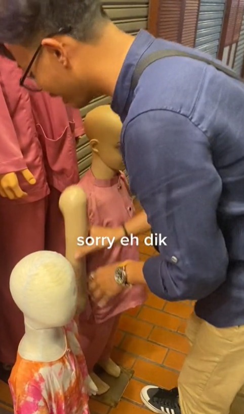 Menerusi video yang dimuat naik oleh @thirf_ di TikTok, kelihatan seorang individu merakam gelagat seorang lelaki yang sedang bersalaman dengan sebuah patung budak lelaki berbaju Melayu di sebuah kedai baju di kawasan lot kedai.