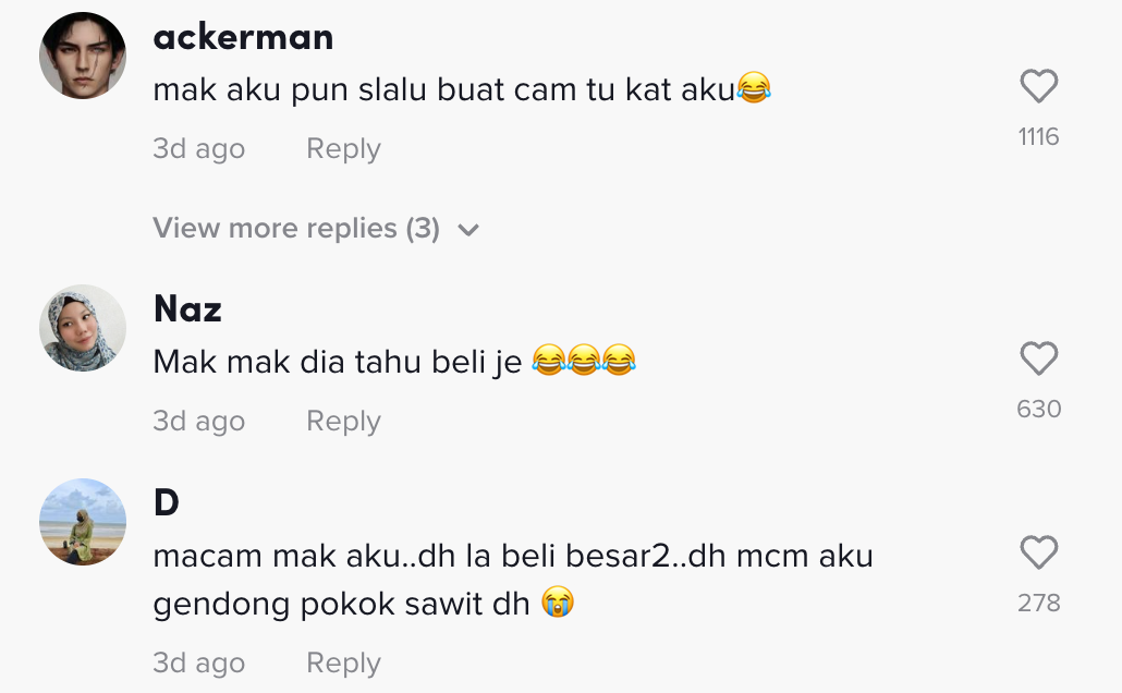 "Macam mak aku, dah lah beli besar-besar dah macam aku gendong pokok sawit dah" – Netizen