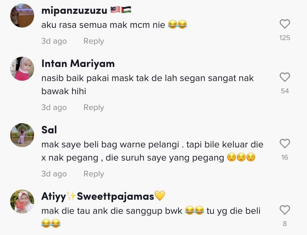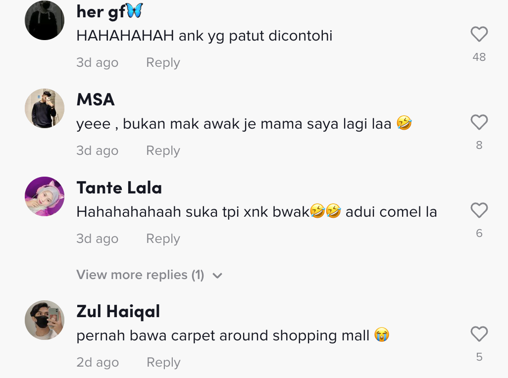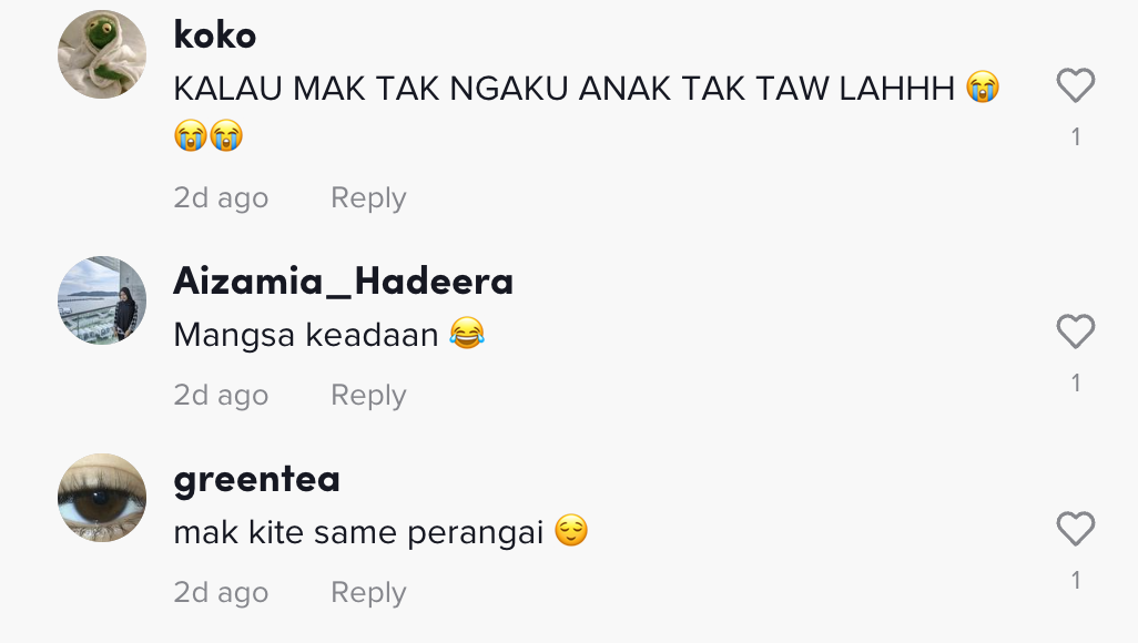 Sementara itu, tinjauan di ruangan komen mendapati rata-rata netizen turut merasa terhibur melihatnya. Malah, ada juga yang berkongsi perangai sama ibu mereka.