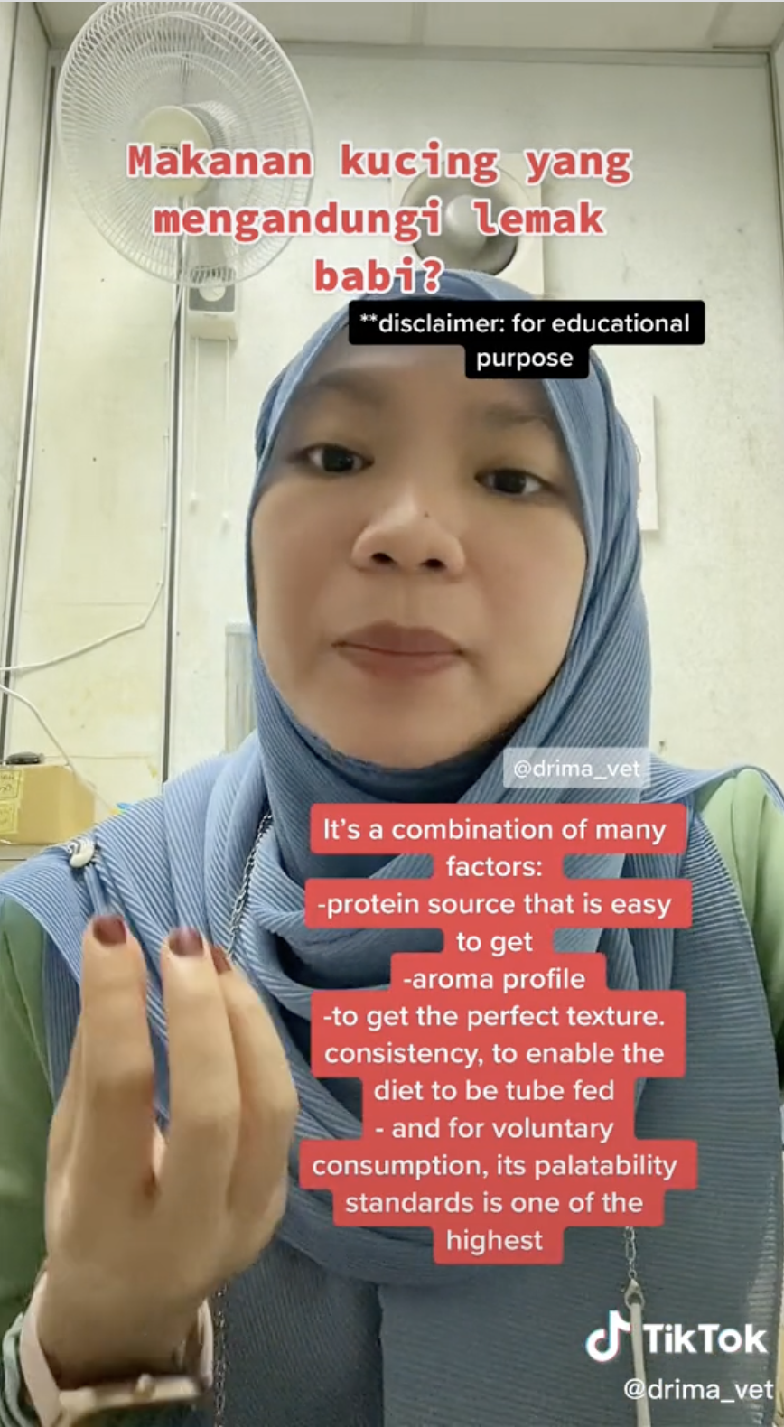 Menerusi video tersebut, kelihatan seorang pakar veterinar berkongsi pandangan selepas video yang tular mengatakan ada lemak dalam sebuah produk jenama makanan kucing.