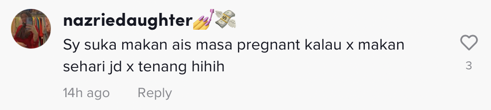 Susulan tularnya video tersebut yang kini meraih sehingga 410.2K views, 21.2K likes dan 904 comments di TikTok, rata-rata netizen menunjukkan pelbagai reaksi terhadap video tersebut. Malah, ada juga yang berkongsi pengalaman mengidam masing-masing.