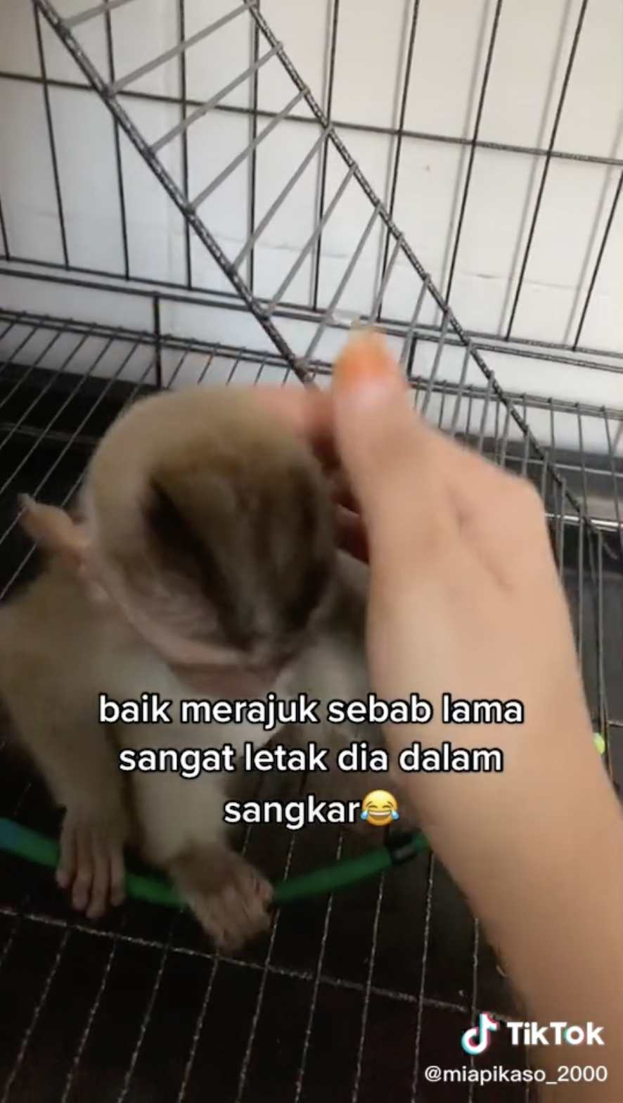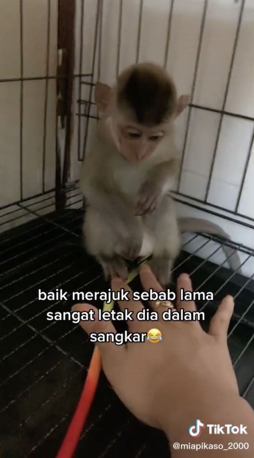 Dia kemudian membuka sangkar untuk membawa haiwan berkenaan untuk keluar. Namun, apa yang lebih mencuri tumpuan adalah anak monyet itu seolah-olah seperti merajuk kerana mungkin dikurung di dalam sangkar.