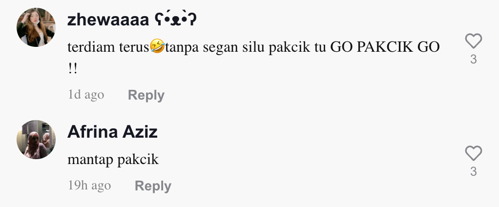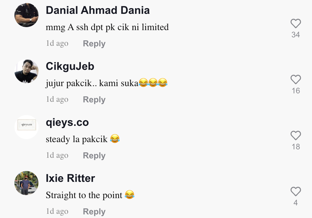 Dalam pada itu, tinjauan di ruangan komen mendapati rata-rata netizen turut merasa terhibur mendengar jawapan pak cik tersebut.