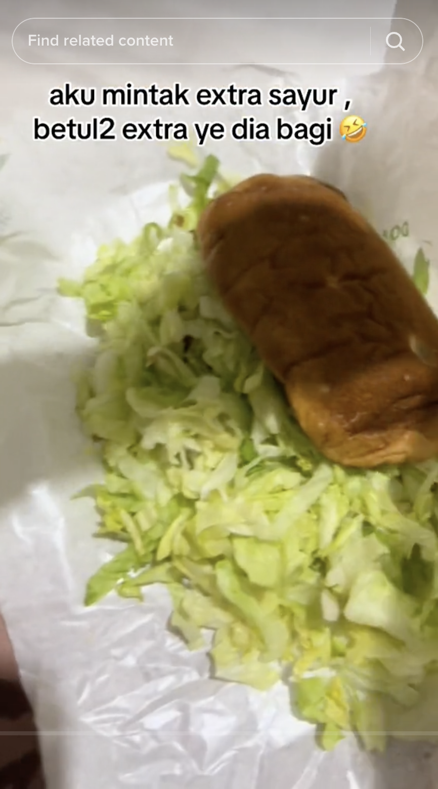 Difahamkan, dia meminta permintaan istimewa iaitu sayur lebih ke dalam burgernya. Namun, sebaik saja medapat makanan, dia terkejut melihat hasilnya.