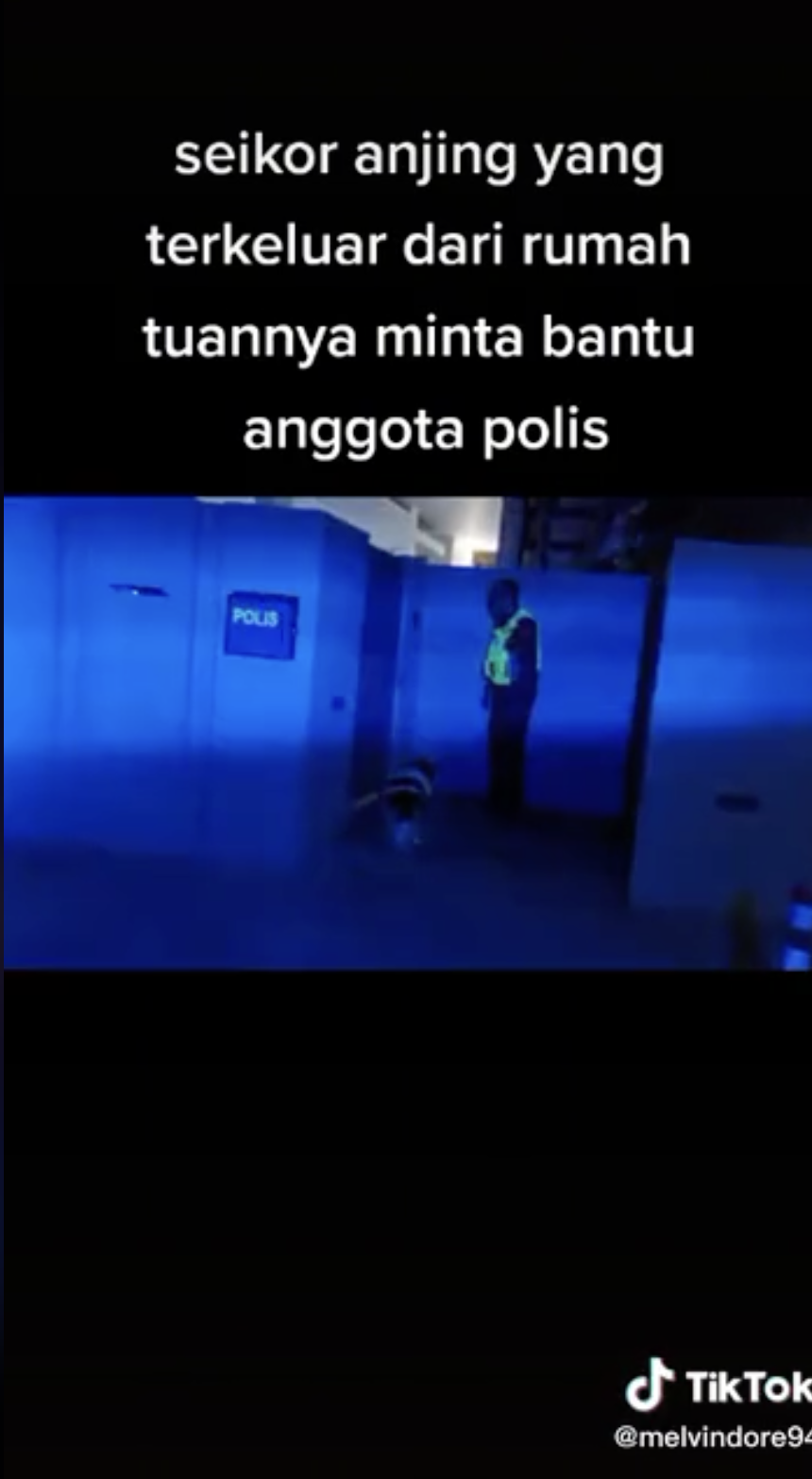Menerusi video tersebut, kelihatan anjing itu seolah-olah meminta tolong seorang anggota polis selepas saja dia gagal memasuki rumah tuannya.