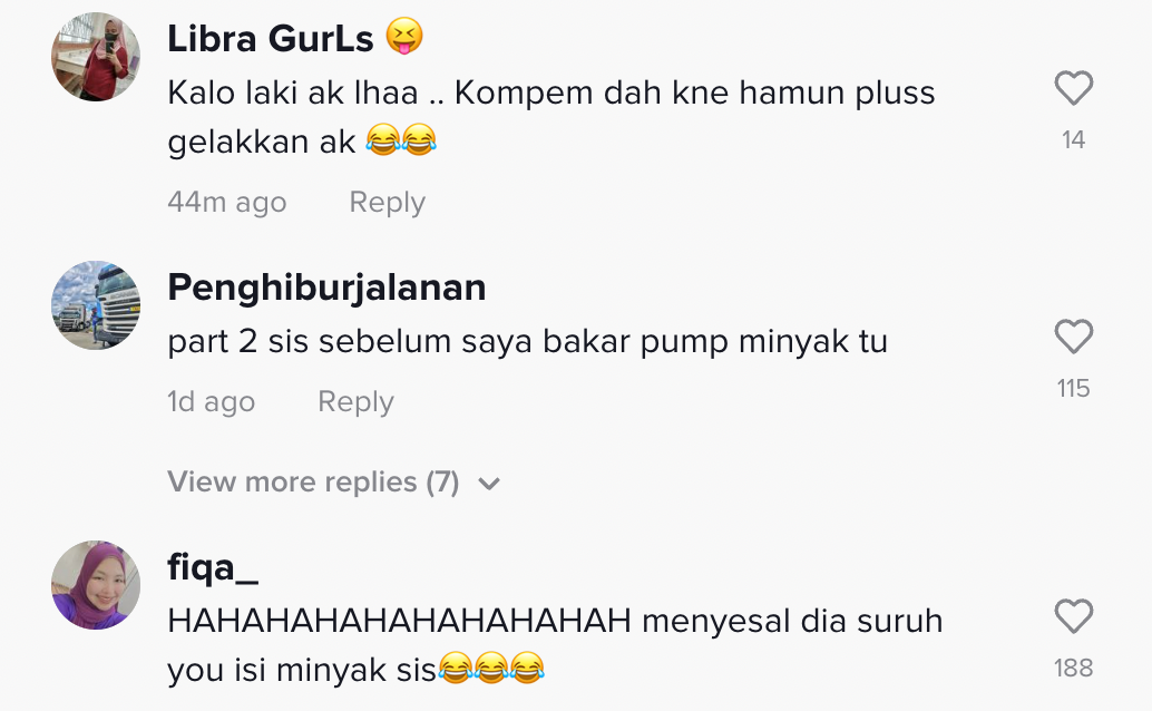 Gadis itu menjawab ya dan ia merupakan perkara biasa yang selalu dilakukannya ketika ingin mengisi minyak. Apa yang lebih melucukan lagi, dapat dilihat muka teman lelakinya bertukar seperti menahan marah dengan kelakukannya itu.