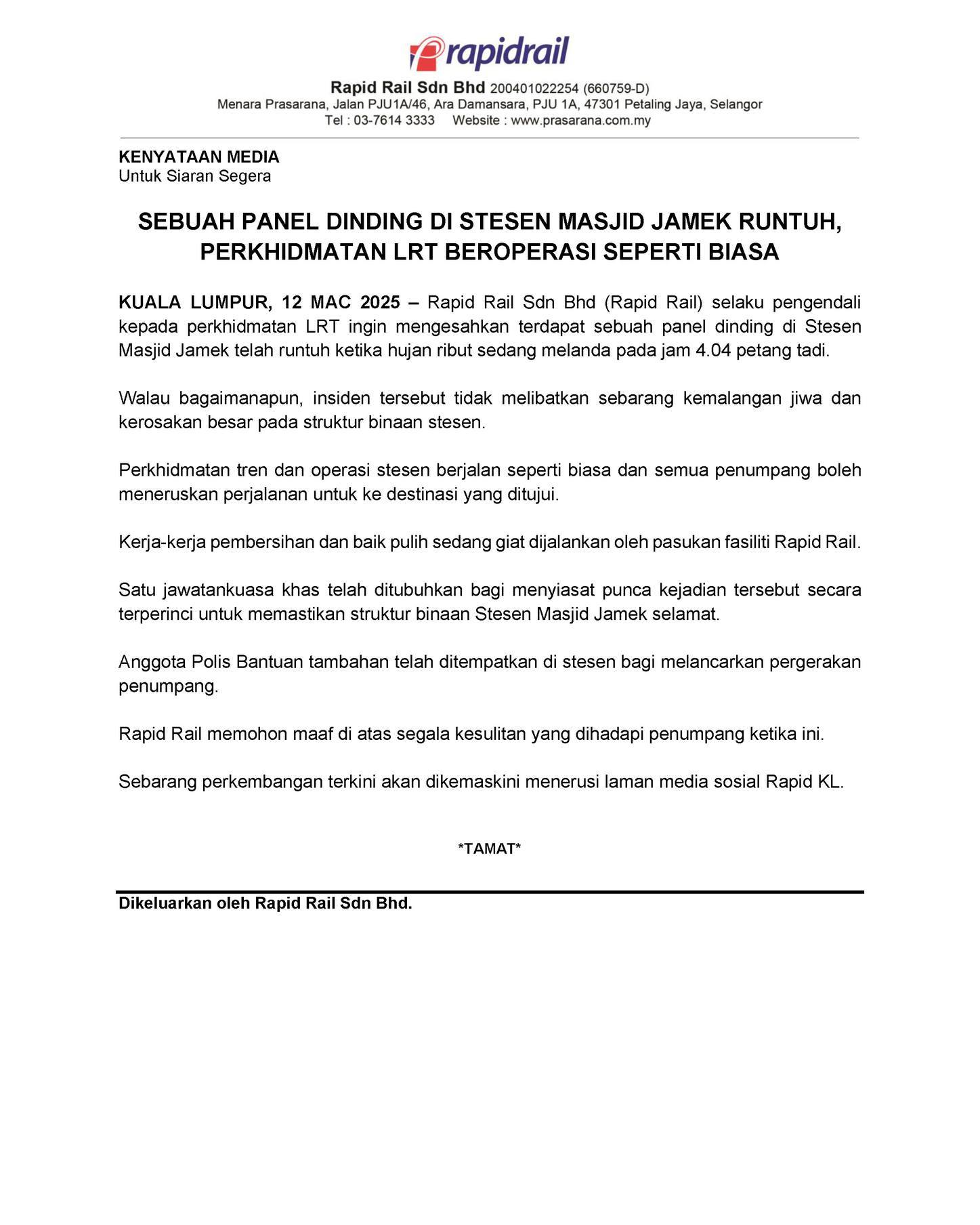 Menerusi sebuah kenyataan media di Facebook, Rapid Rail Sdn Bhd (Rapid Rail) selaku pengendali perkhidmatan LRT dalam kenyataan memaklumkan, panel itu runtuh ketika hujan sedang melanda pada jam 4.04 petang semalam.