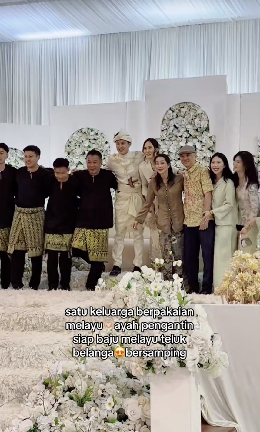 Malah, keluarga pengantin juga dilihat memakai pakaian tradisional berbaju Melayu dan kebaya. Majlis perkahwinan berkenaan turut dilengkapi dengan kompang ketika menyambut pasangan pengantin.