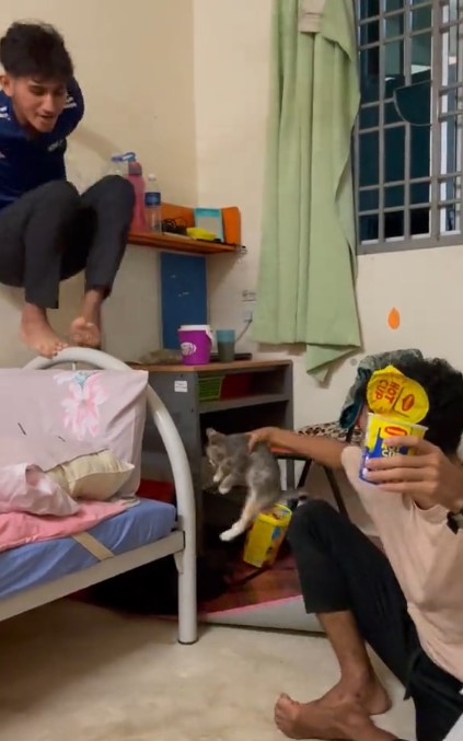 Menerusi video hantaran @y4k22 itu, pelajar itu dilihat menjauhi anak kucing tersebut sehingga memanjat katil dan menjerit kepada rakannya supaya menjauhkan anak kucing itu darinya.