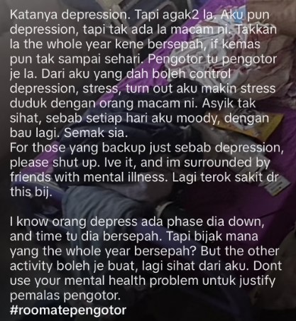 Baru-baru ini, tular sebuah video di TikTok yang telah disebarkan ke laman X memaparkan seorang pelajar stres melihat rakan sebiliknya menjadi pengotor membiarkan bilik mereka bersepah.