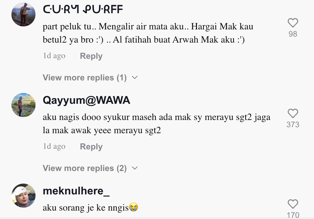 Sementara itu, tinjauan di ruangan komen mendapati rata-rata netizen turut merasa terharu melihat reaksi ibu dan ayahnya itu. Ada juga yang meluahkan rasa sebak mereka.