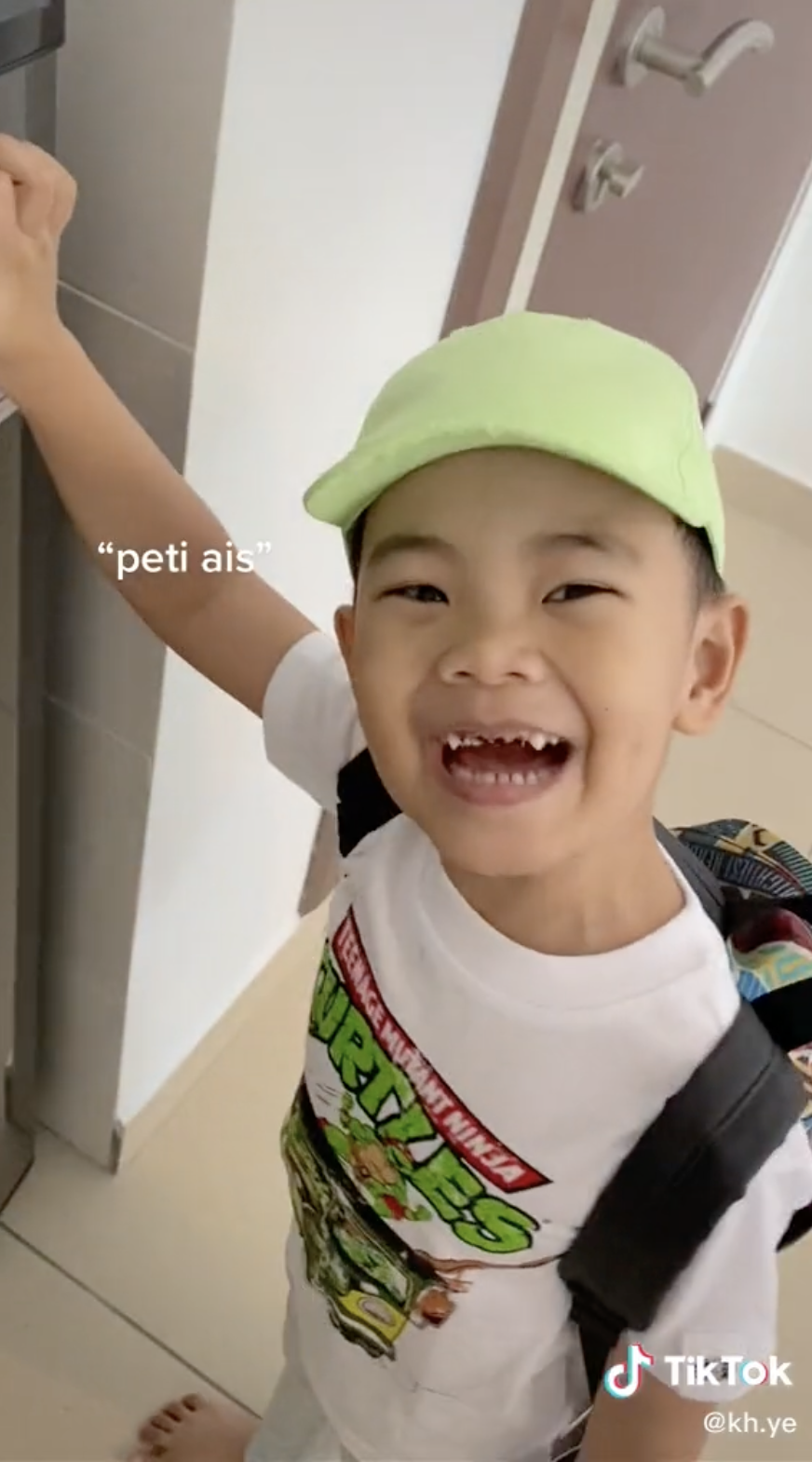 Dia kemudian menyuruh budak itu mengeja jenama peti ais tersebut sambil menunjuknya. Tetapi, apa yang lebih mencuri perhatian adalah sebaik saja selesai mengeja, dia menyuruh agar budak itu menyebutkannya tetapi budak itu malah menyebut "peti ais" dan bukan Panasonic.