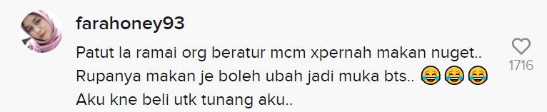 Sementara itu, tinjauan di ruangan komen mendapati rata-rata netizen turut terhibur melihat perubahan wajah lelaki tersebut. Malah, ada juga yang berkongsi keterujaan mereka untuk mendapatkan BTS Meal itu.
