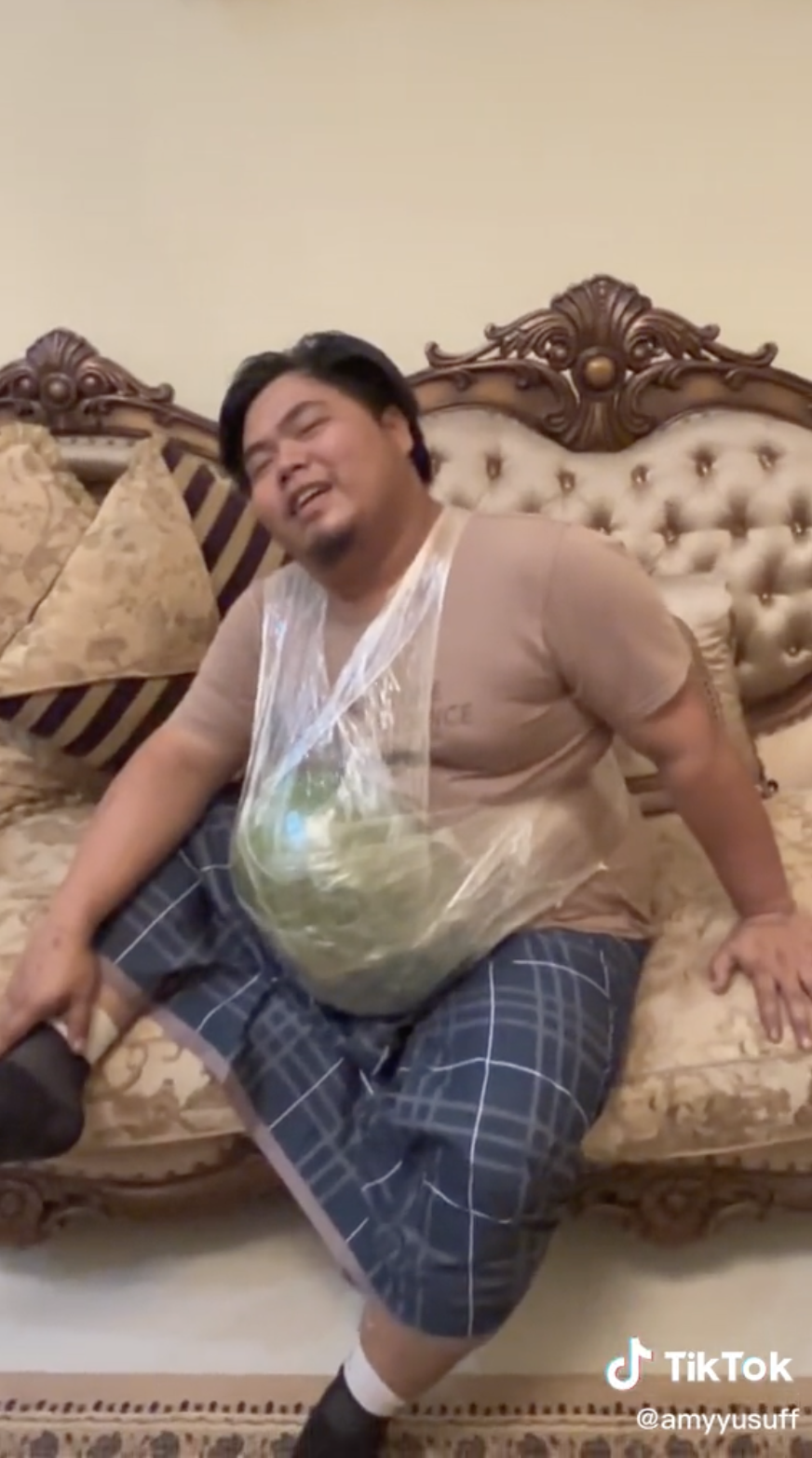 Lelaki itu kemudian dilihat dipakaikan tembikai pada perutnya sambil dibantu oleh anak-anaknya. Sebaik saja memakainya, si isteri terus menyuruh suaminya melakukan perkara-perkara yang selalu dilakukannya seperti duduk dan bangun, memakai stokin dan baring.