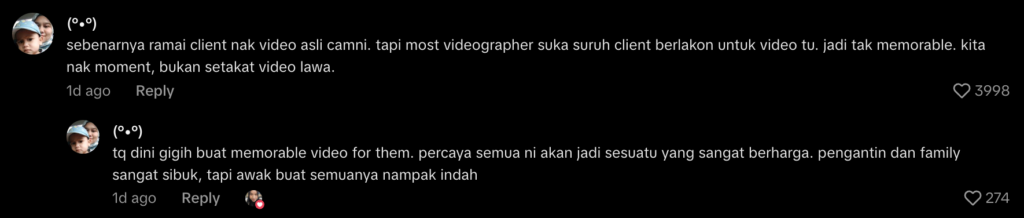Malah, idea videographer yang meletakkan rakaman candid ahli keluarga pengantin membuatkan suasana majlis itu lagi meriah dan mencipta kenangan indah buat mereka sekeluarga.
