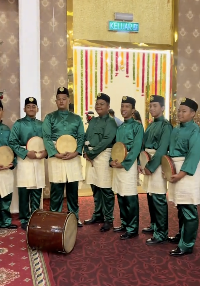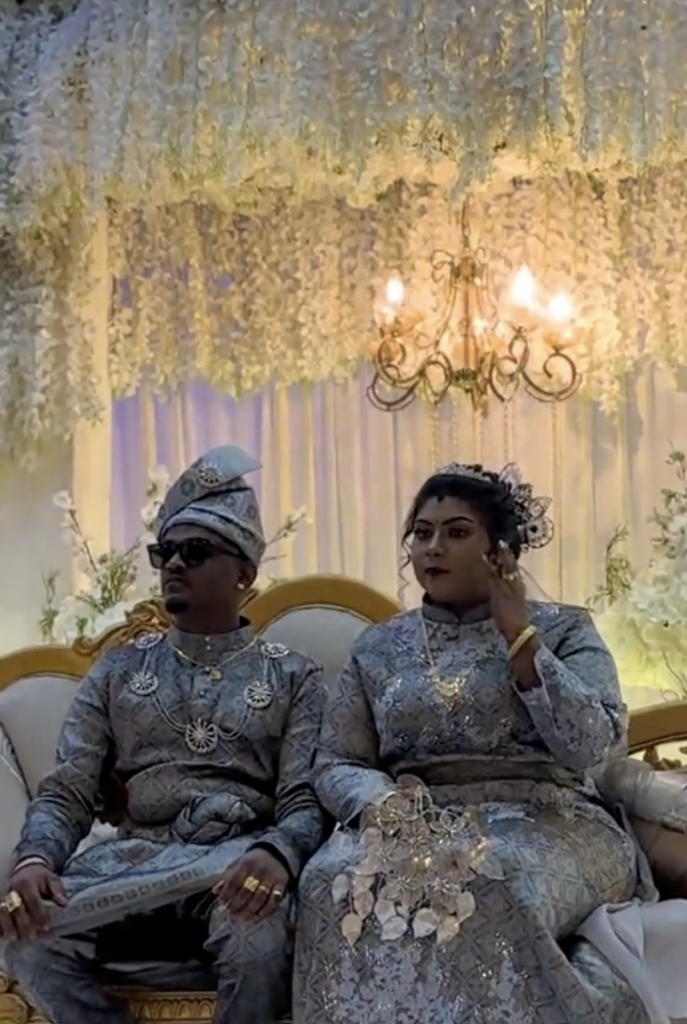 Menerusi video yang dimuat naik oleh @thamayanthi._ di TikTok, kelihatan pasangan pengantin itu diiringi kumpulan kompang sebelum berarak masuk ke dewan dan duduk di pelamin.