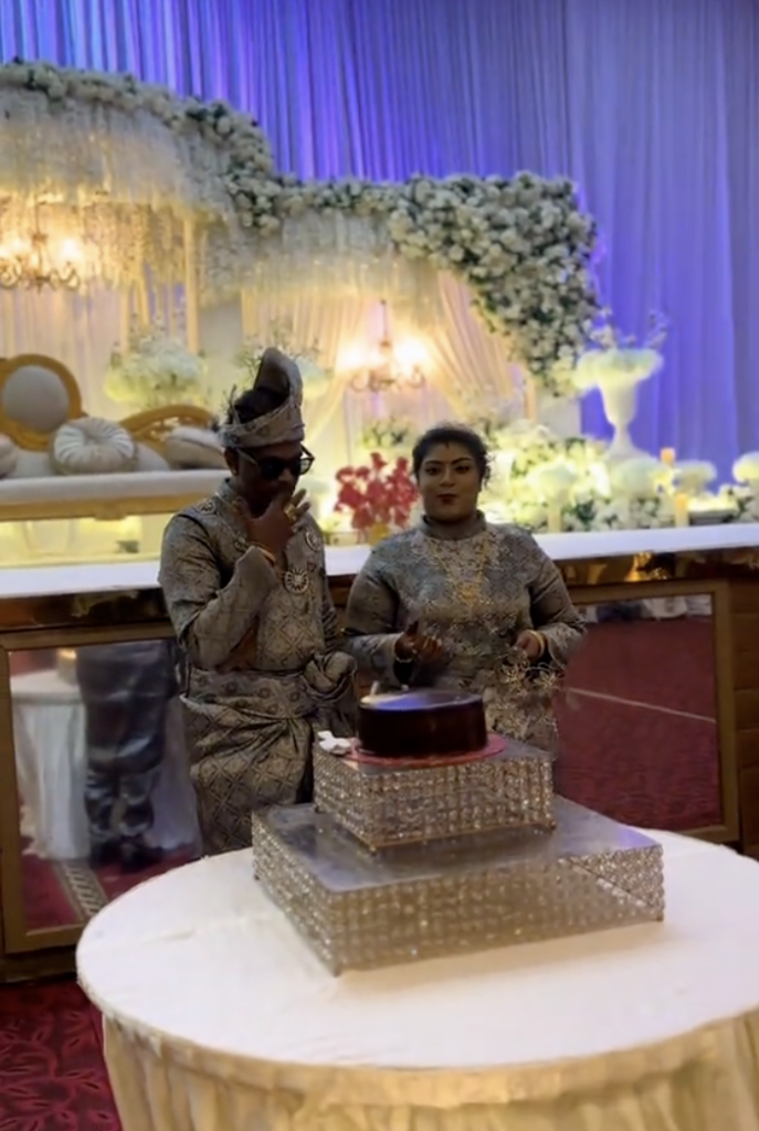 Suasana majlis kahwin itu disambut dengan penuh meriah oleh para tetamu. Malah, pasangan pengantin dilihat turut memakai busana songket berwarna kelabu.