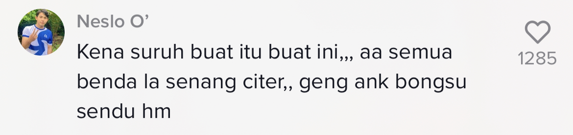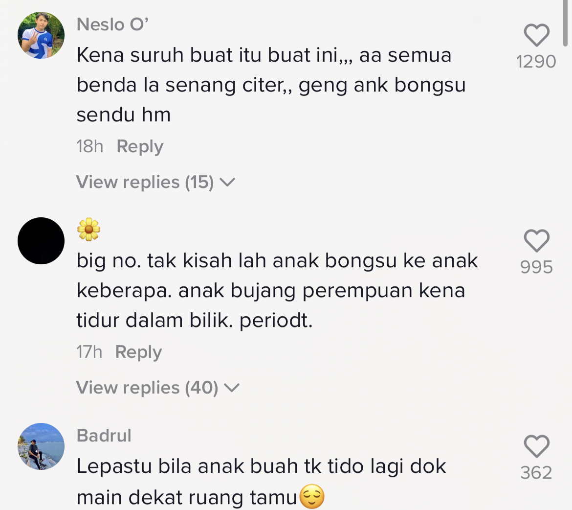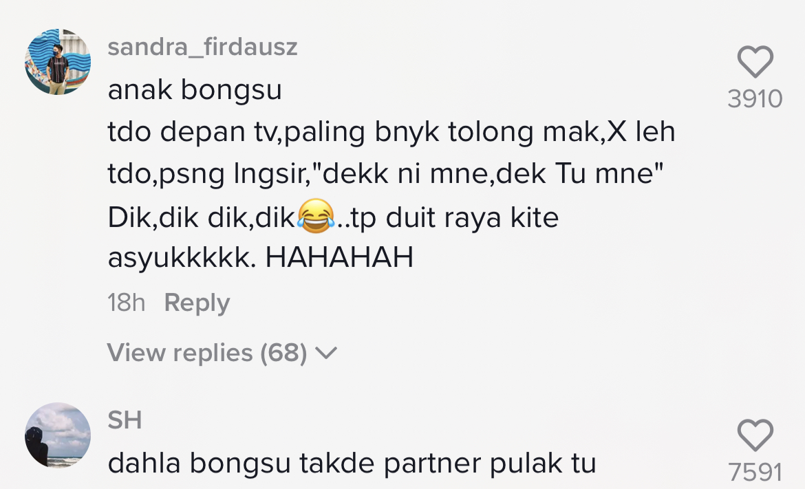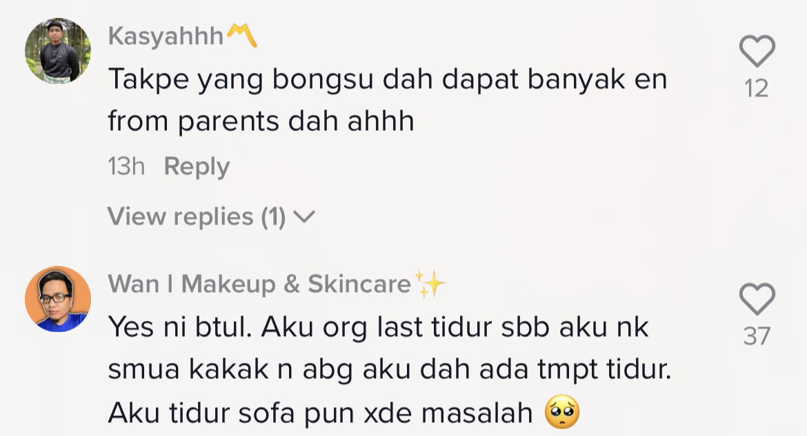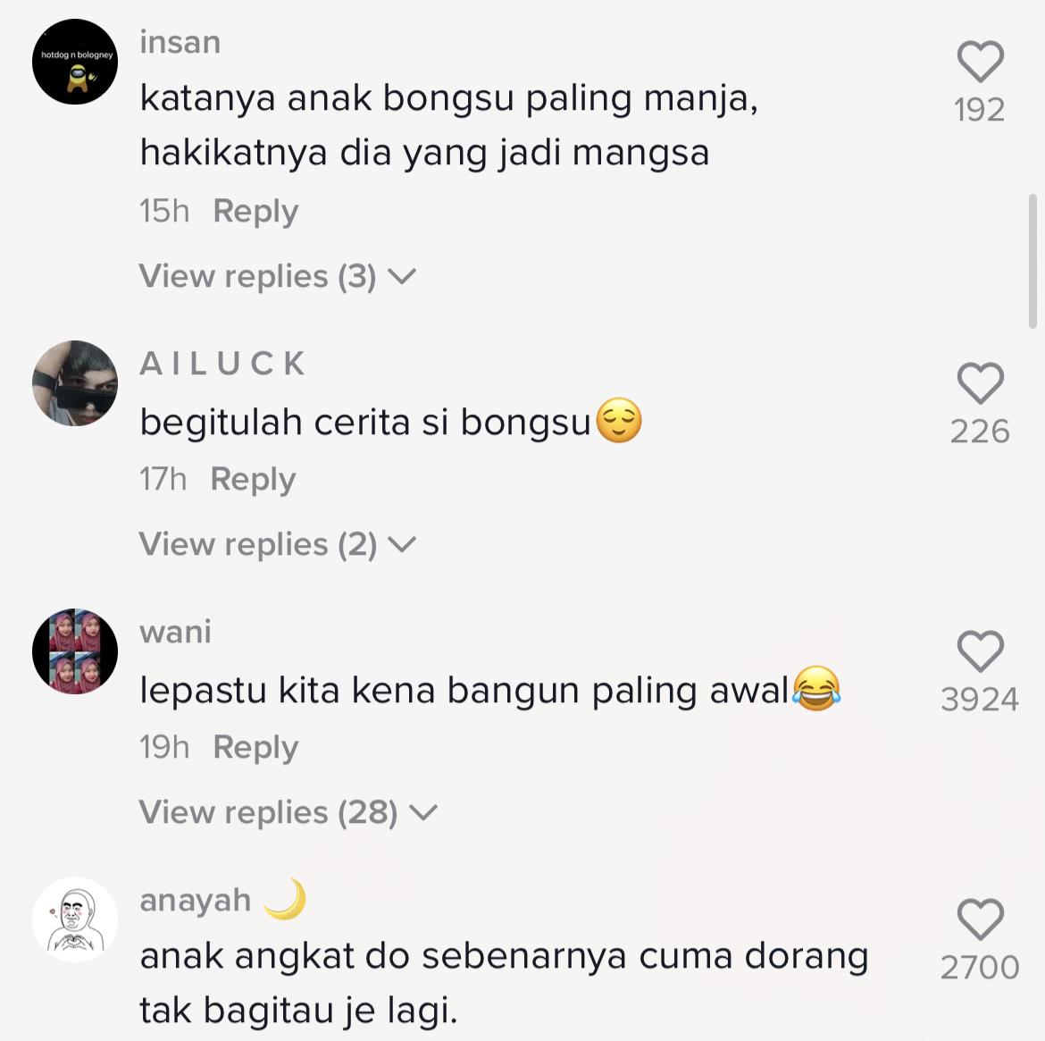 Sementara itu, tinjauan di ruangan komen mendapati rata-rata netizen turut merasai pengalaman tidur di ruang tamu seperti gadis tersebut. Malah, ada juga netizen yang berkongsi nasib menjadi anak bongsu yang lain.