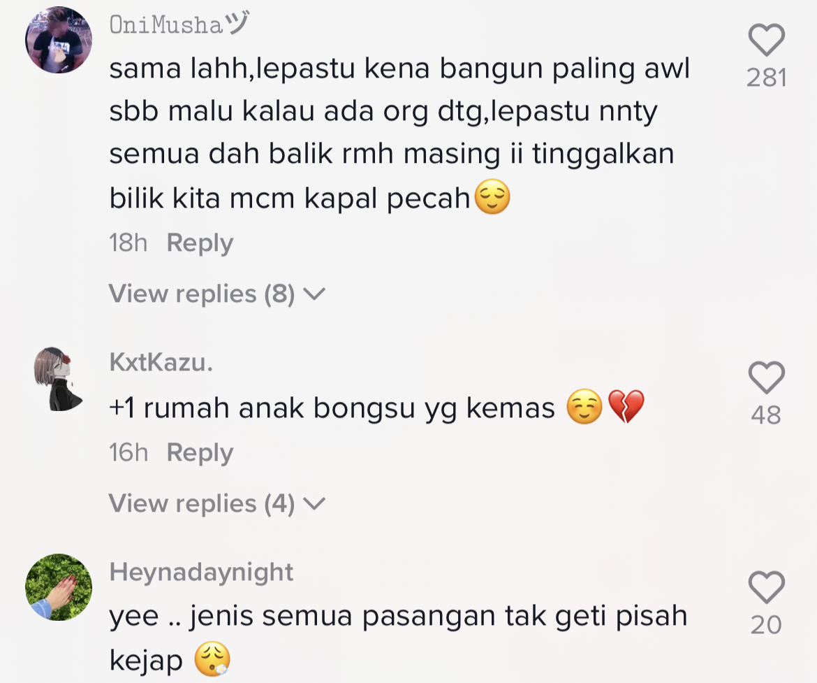 "Samalah. Lepastu kena bangun awal sebab malu ada orang datang. Nanti semua dah balik mesti tinggalkan bilik kita macam kapal pecah" – Netizen