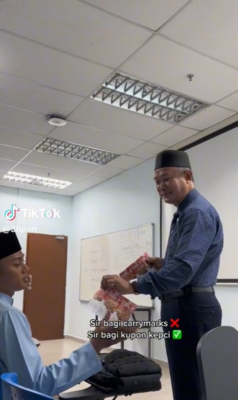 Difahamkan, itu adalah pensyarahnya yang sedang memberi kupon KFC kepada pelajar-pelajarnya di sebuah universiti awam pada hari Jumaat ketika kelas.
