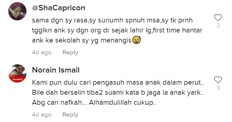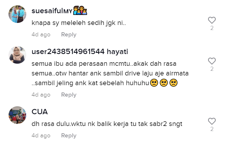 Sama seperti video yang tular di TikTok baru-baru ini apabila seorang wanita tidak dapat menahan sebak ketika menghantar anaknya pertama kali ke rumah pengasuh.