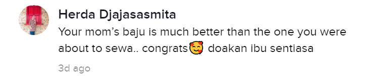 Selain itu, dia juga mengakui dengan memakai busana itu ia dapat merasakan seperti arwah ibunya itu berada dekat di sampingnya.
