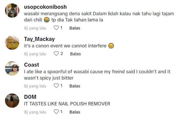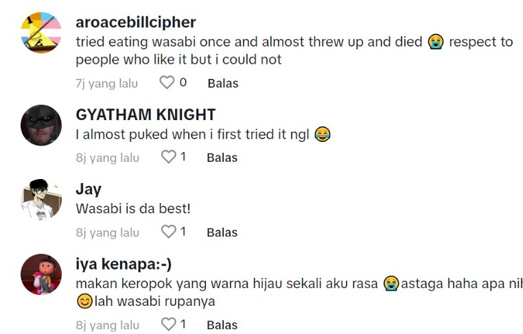 Dalam pada itu, tinjauan di ruangan komen mendapati rata-rata netizen turut terhibur melihat matanya selepas mencuba wasabi itu dan ramai juga yang boleh relate dengan wanita tersebut.