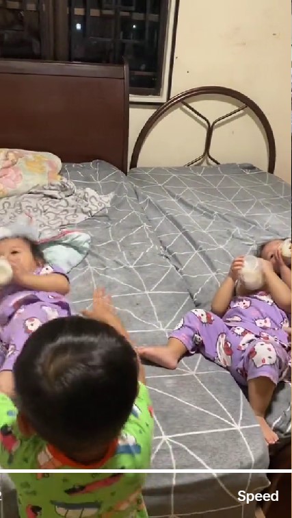 Apa yang menarik perhatian netizen adalah cara mereka baringkan adik-adiknya selepas diberikan susu. Kakak dan abang kepada kembar itu dilihat bersahaja menolak kembar tersebut untuk membaringkan mereka.