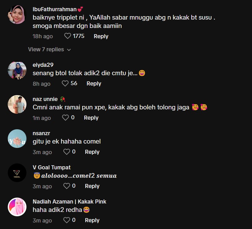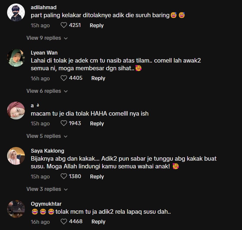 Rata-rata komen yang diberikan netizen di TikTok memberikan reaksi terhibur dengan gelagat adik-beradik itu.