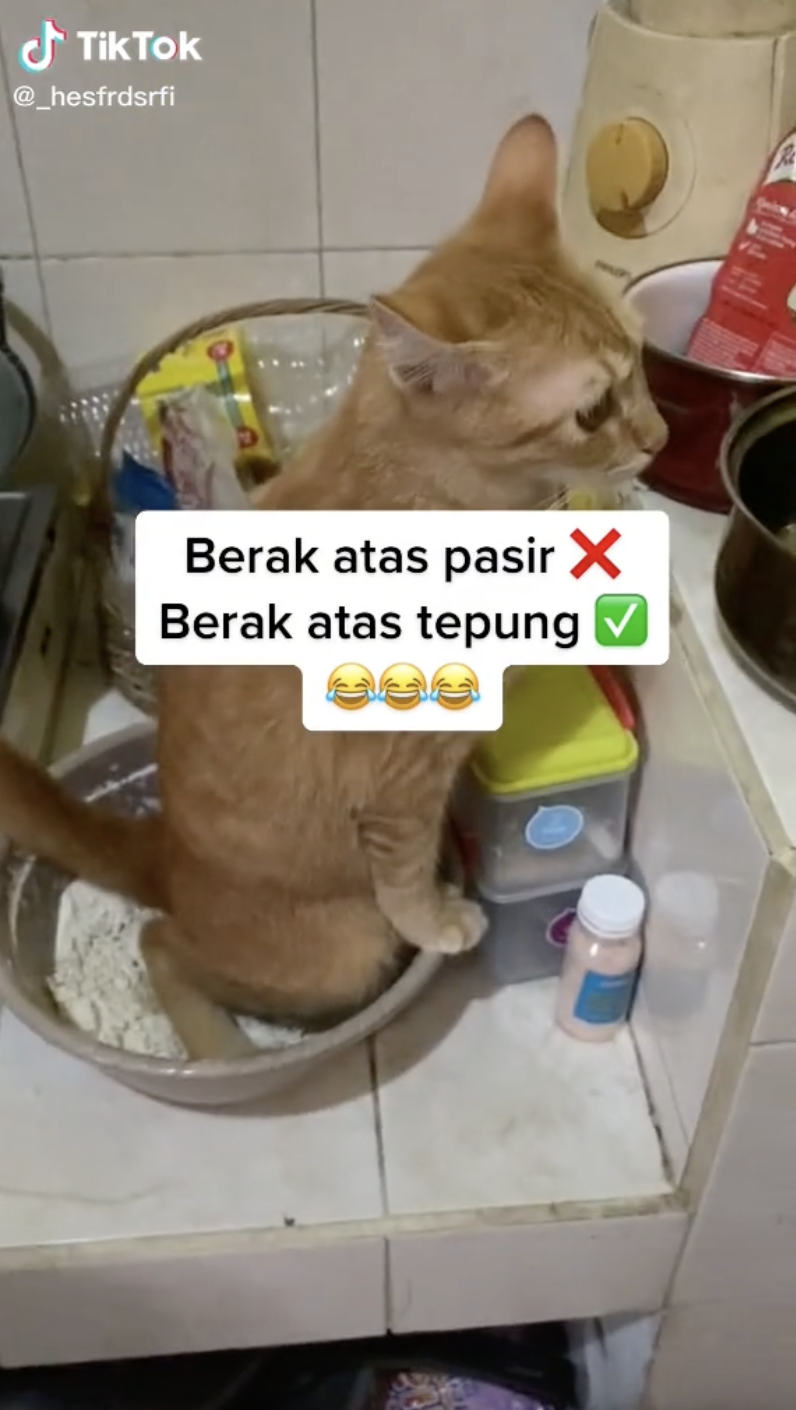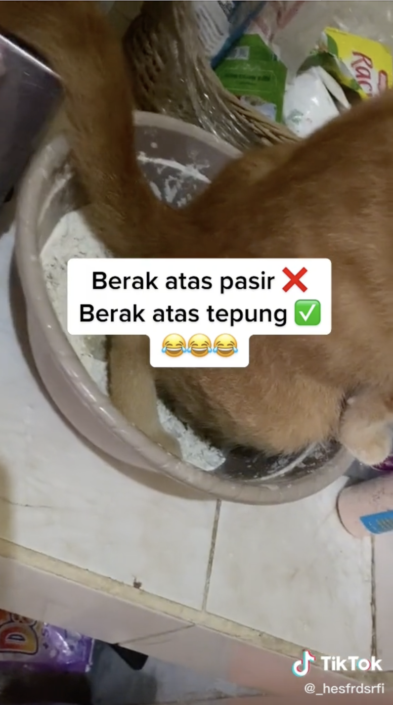 Apa yang mengejutkan netizen adalah apabila kucing tersebut sebenarnya sedang berak di atas tepung yang berada di dapur itu. Mungkin si Oyen ingatkan tepung itu pasir.
