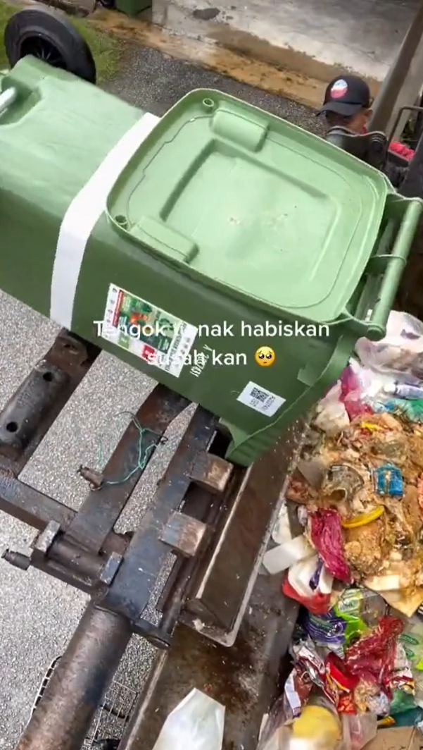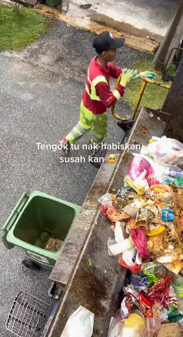 Menerusi ciapan berkenaan, kelihatan seorang pekerja kebersihan sedang mengangkat tong sampah untuk dibuang ke dalam lori.