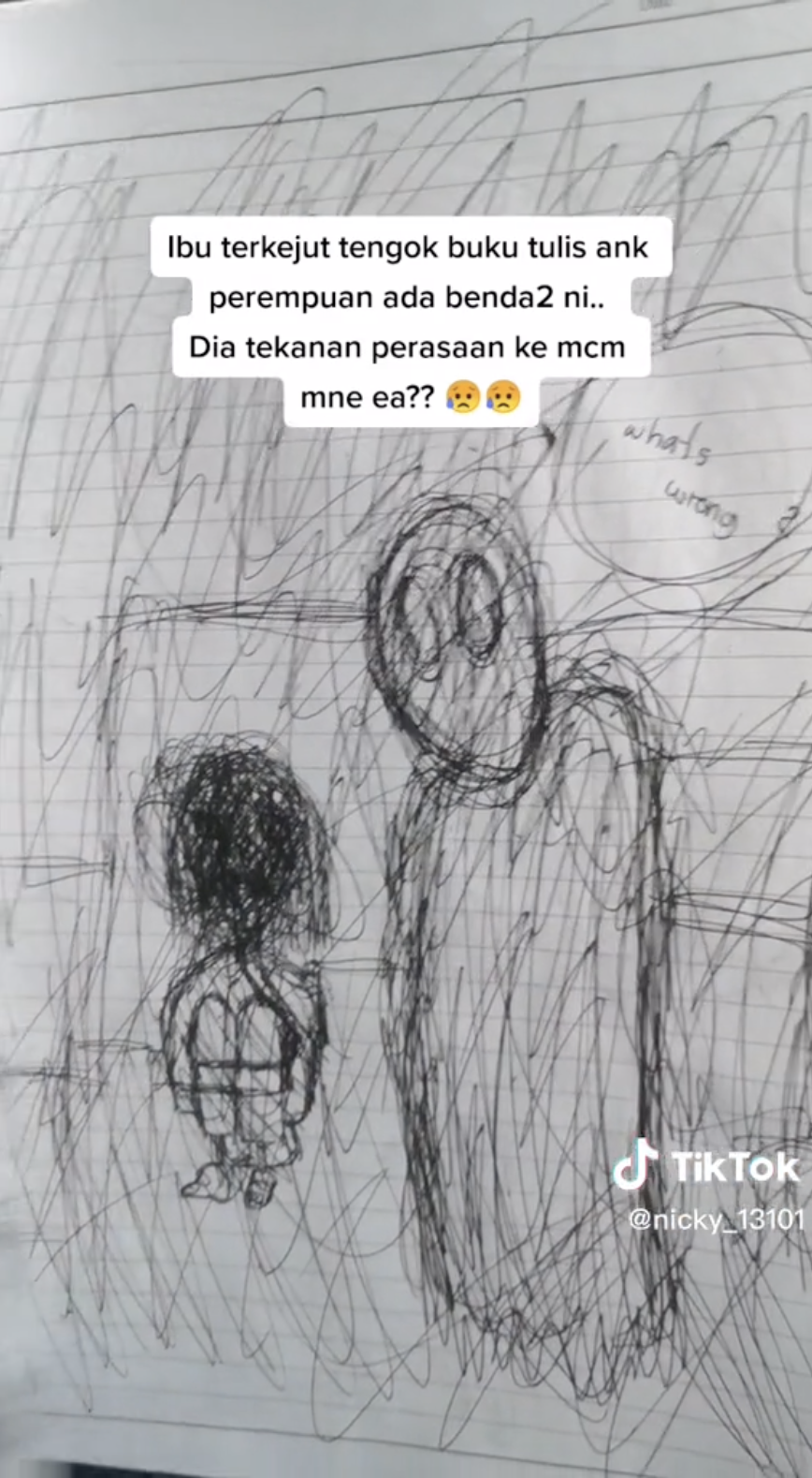 Wanita itu mendedahkan beberapa lukisan dari buku tulis yang agak menyeramkan dimana tidak pernah dilakukan oleh anaknya itu. Malah, dia juga memberitahu anaknya itu tidaklah berapa pandai melukis.