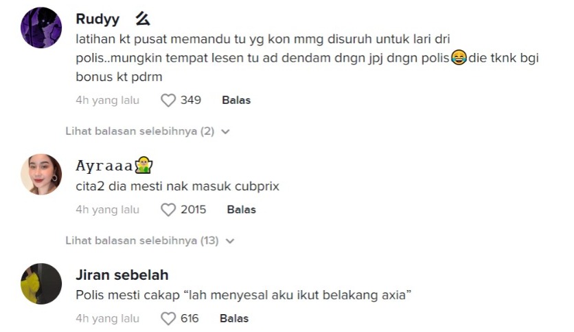 "Latihan dekat pusat memandu tu yang kon memang disuruh untuk lari dari polis, mungkin tempat lesen tu ada dendam dengan JPJ dngn polis. Dia taknak bagi bonus dekat PDRM" – Netizen