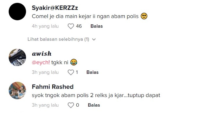Menerusi video yang dimuat naik oleh @hafizmurad21 di TikTok, kelihatan seorang individu merakam gelagat seorang lelaki yang sedang melarikan diri daripada polis trafik di sebuah kawasan kampung.