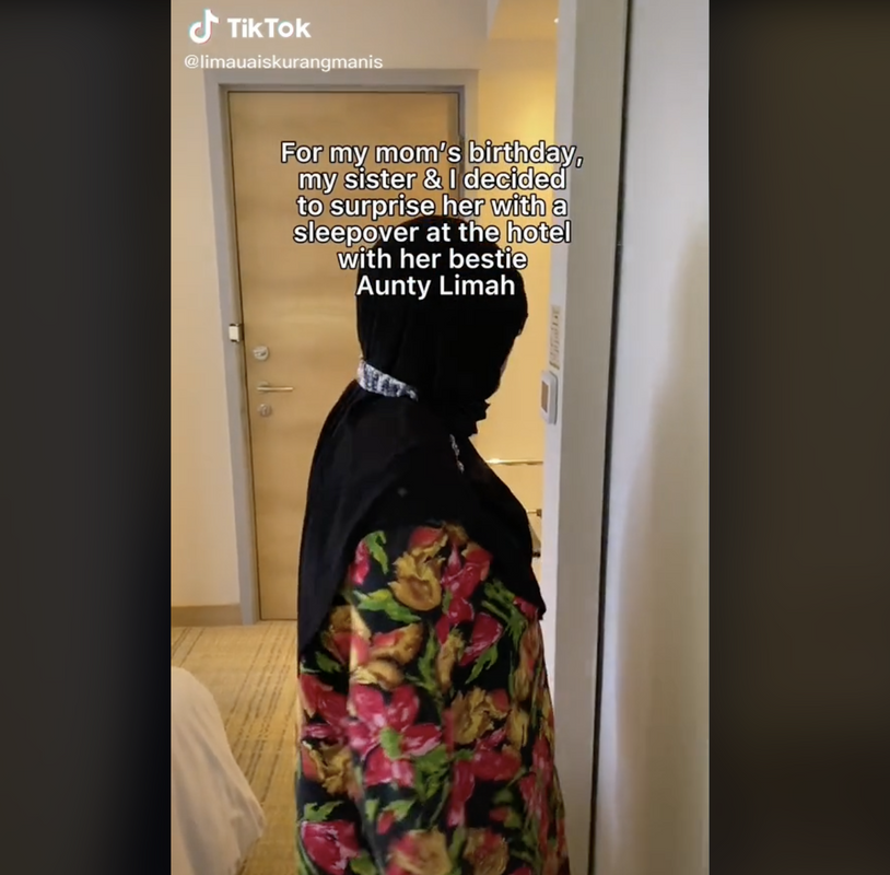 Menerusi video yang dikongsi oleh @limauaiskurangmanis, seorang wanita telah membuat kejutan sempena hari lahir ibunya. Dia telah membawa rakan baik ibunya dan bersembunyi di dalam sebuah bilik hotel secara senyap.