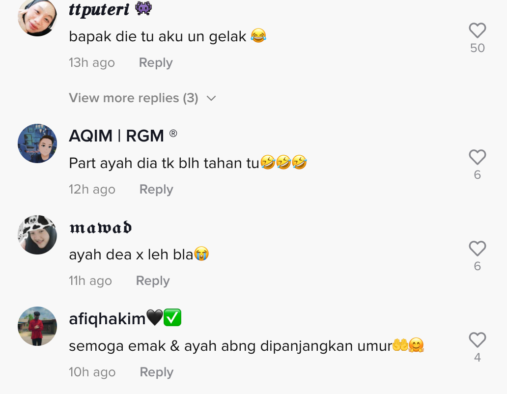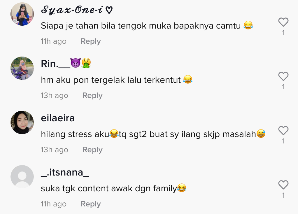 Dalam pada itu, tinjauan di ruangan komen mendapati rata-rata netizen turut merasa terhibur melihat gelagat keluarga berkenaan. Malah, ada yang suka tengok hubungan antara mereka.