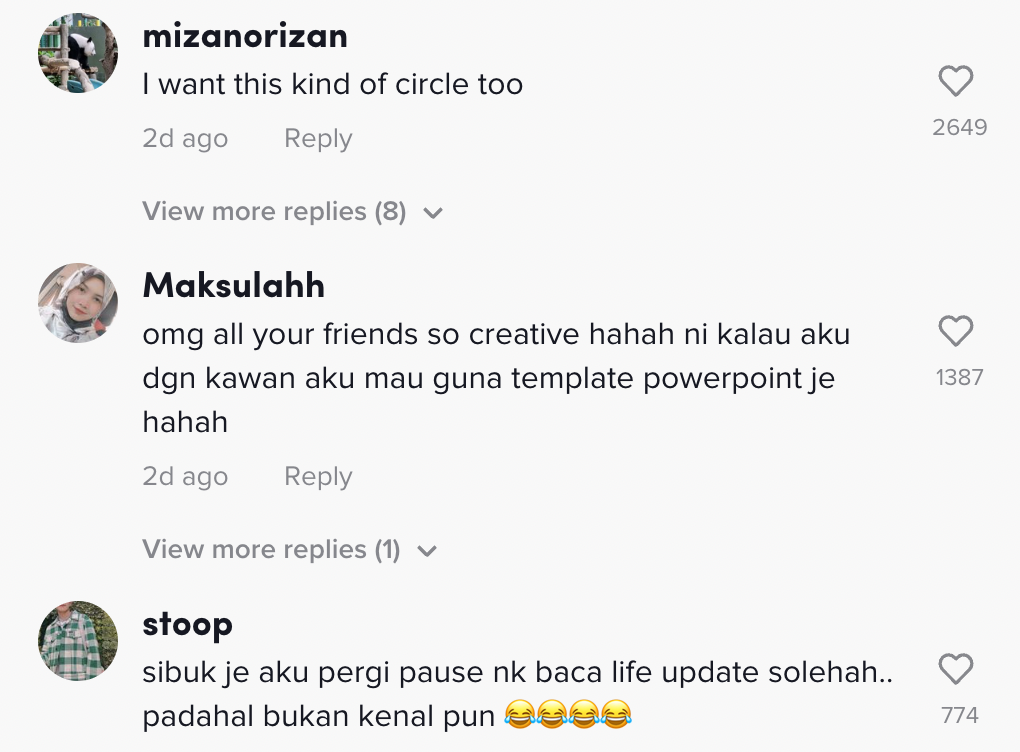 Lain pula dengan video di TikTok ini apabila sekumpulan rakan membentangkan update terbaru diri mereka selepas lama tidak berjumpa telah menarik perhatian ramai.