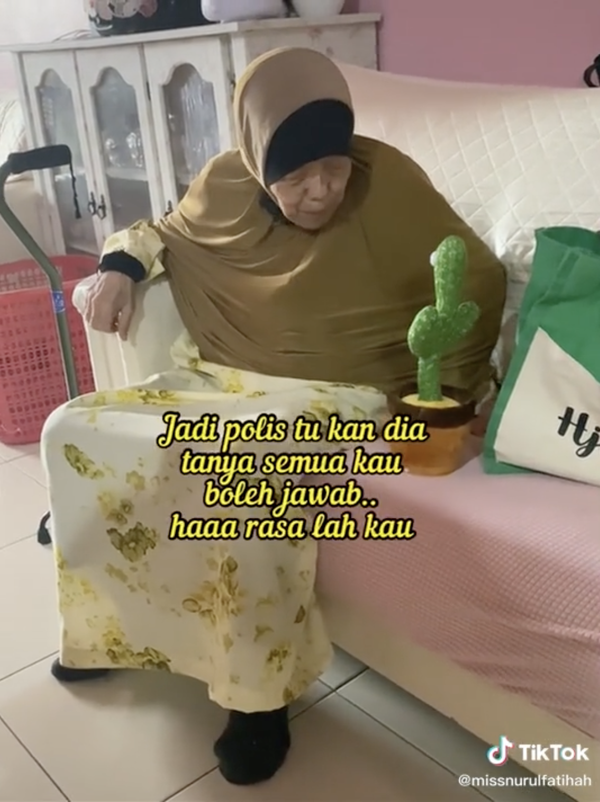 Apa yang lebih mencuri tumpuan adalah nenek itu seolah-olah seperti sedang bercakap dengan dancing cactus tersebut kerana mengajuk percakapannya.