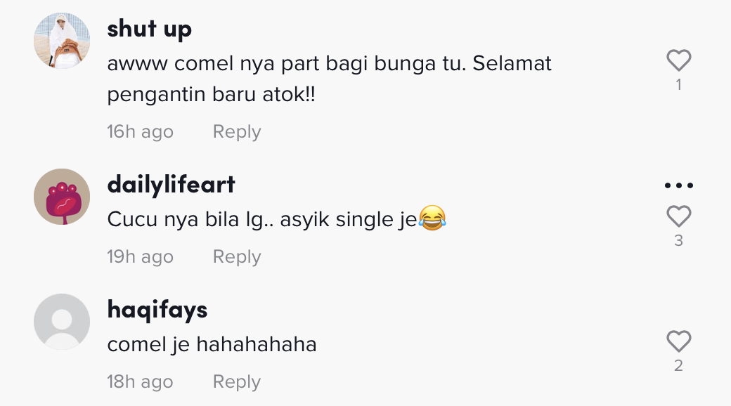 "Comelnya part bagi bunga tu. Selamat pengantin baru atuk!" – Netizen