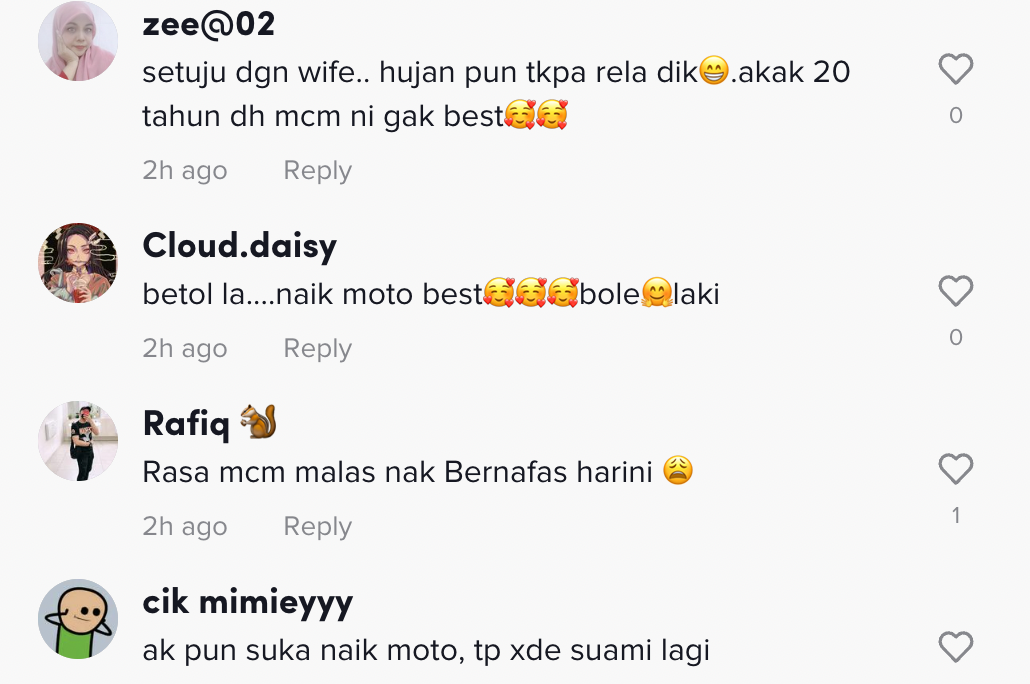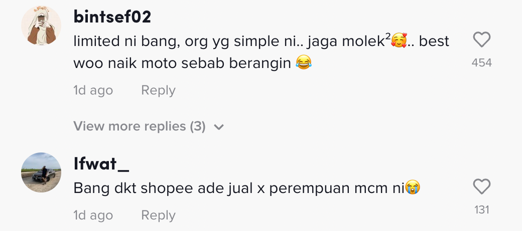 "Limited ni bang, orang yang simple ni. Jaga molek-molek best woo naik moto sebab berangin" – Netizen