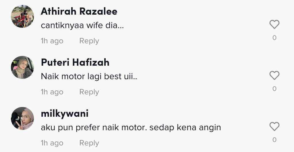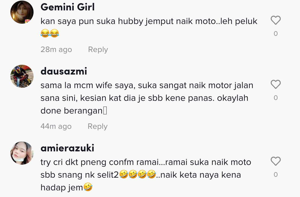 Sama seperti video di TikTok ini apabila si isteri tidak kisah suaminya menjemput balik kerja menaiki motosikal kerana dia suka telah mencuri perhatian ramai.