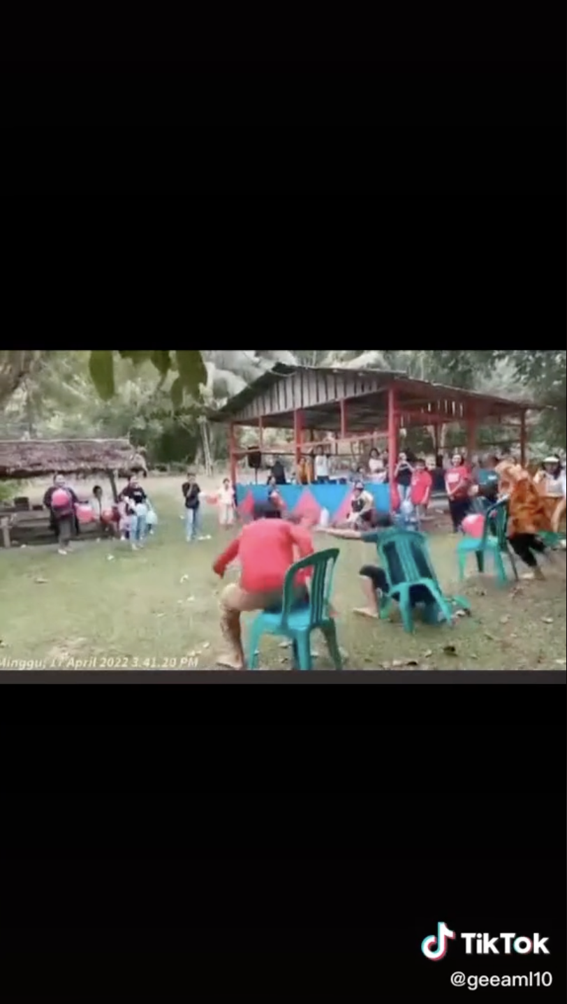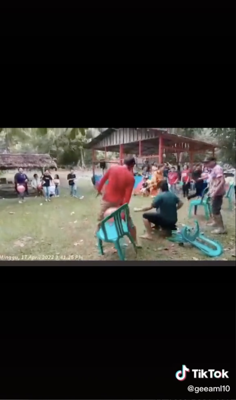 Menerusi video yang dimuat naik oleh @geeaml10 di TikTok, kelihatan beberapa orang sedang bermain acara sukaneka memecahkan belon menggunakan punggung.