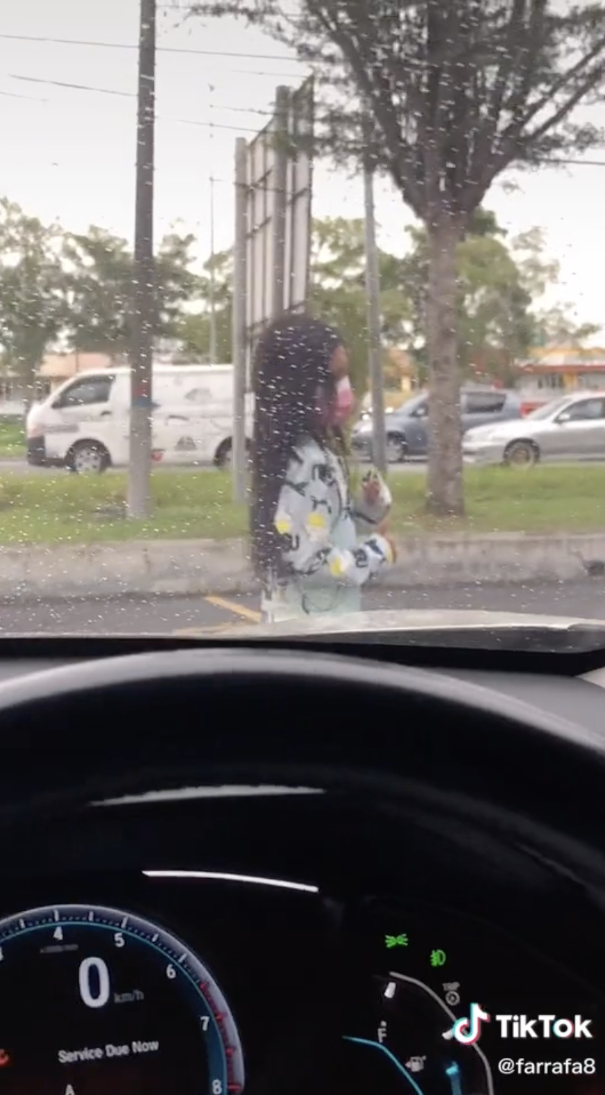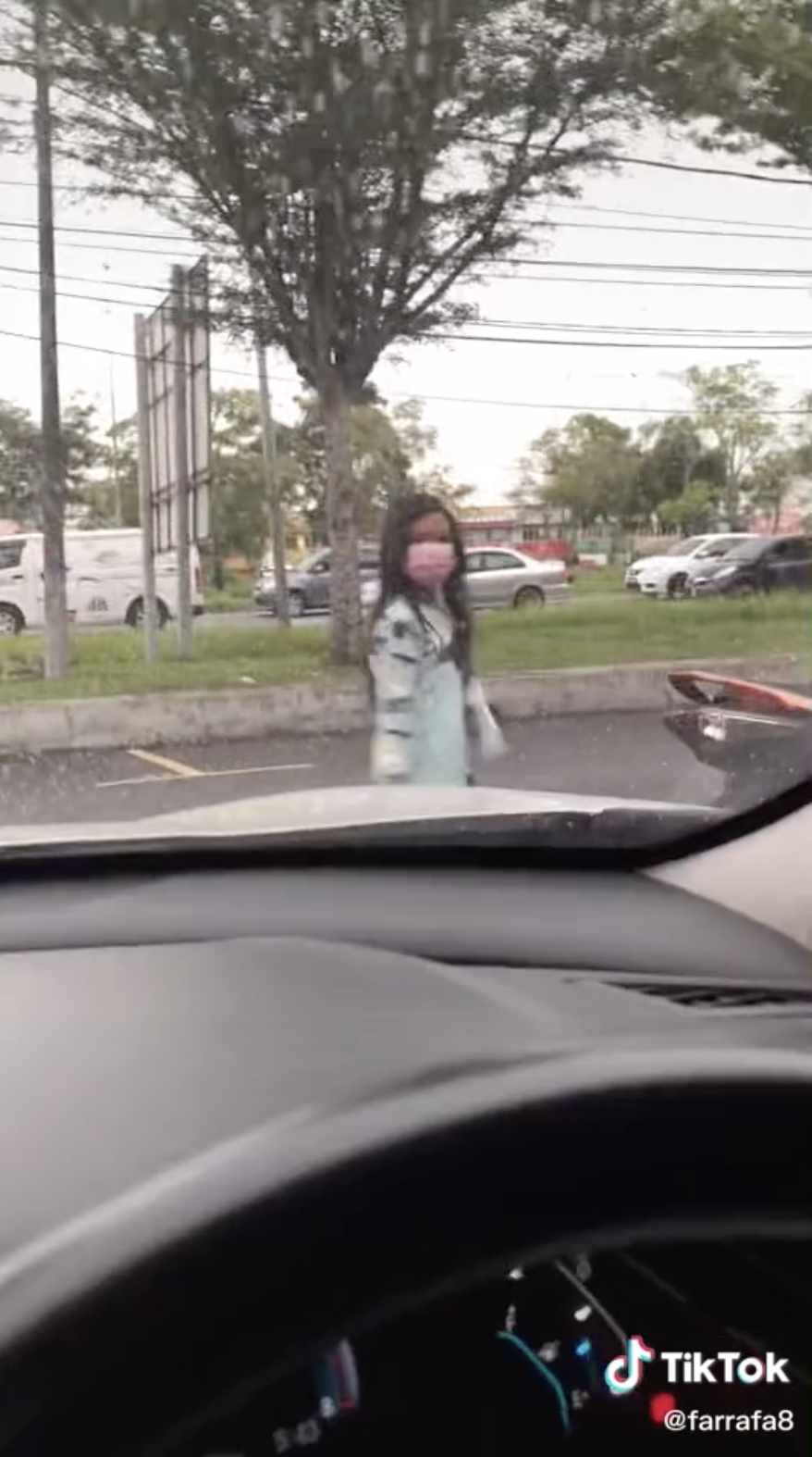 Semasa mereka ingin keluar, tiba-tiba datang seorang budak perempuan berada di depan kereta mereka difahamkan menunggu seseorang. Budak itu dilihat dengan sakan berjoget seperti tarian TikTok di depan kereta itu tanpa menyedari sebenarnya ada orang di dalam.