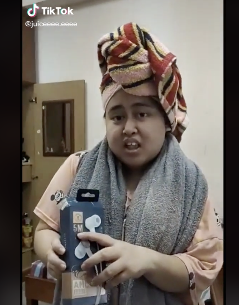 Menerusi video yang dikongsi oleh @juiceeee.eeee, kelihatan seorang gadis sedang menunjukkan kotak earphone 5 meter yang dibelinya.