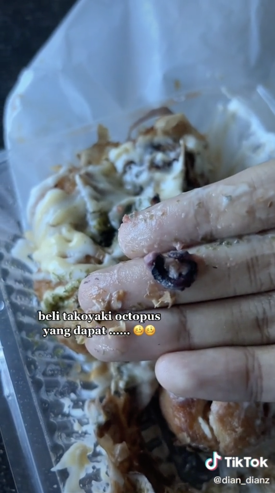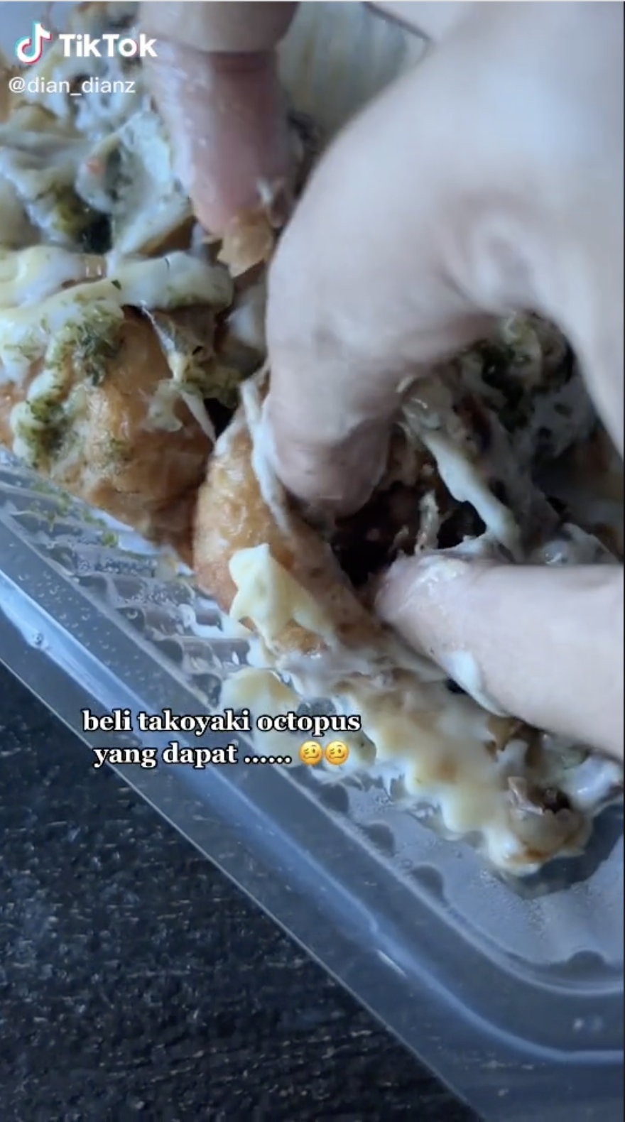 Menerusi video tersebut, seorang wanita berkongsi apa yang dibelinya di sebuah gerai takoyaki. Difahamkan, dia membeli takoyaki dengan isi sotong.