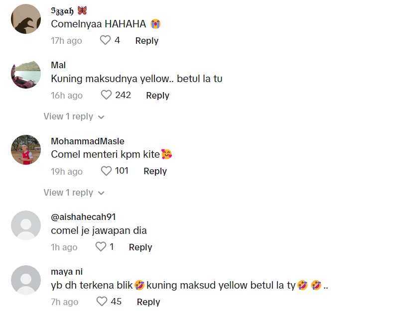Apa yang membuatkan ramai terhibur adalah jawapan murid lelaki tersebut ketika ditanyakan tentang maksud warna kuning pada Jalur Gemilang. Dengan confidentnya murid tersebut menjawab "yellow" sedangkan mungkin jawapan yang diharapkan adalah kedaulatan Raja Berperlembagaan.