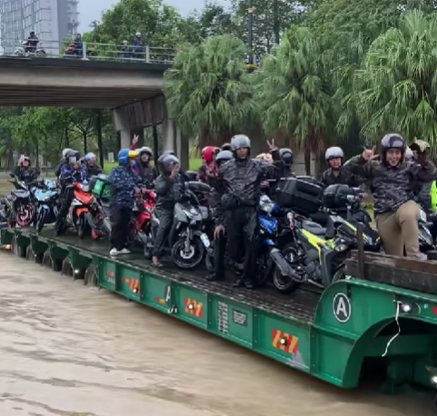 Menerusi video perkongsian @z_mani0 di TikTok, sebuah lori dilihat membantu penunggang-penunggang motosikal yang tersangkut disebabkan banjir dengan membawa mereka bersama motosikal masing-masing meredah banjir.