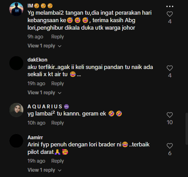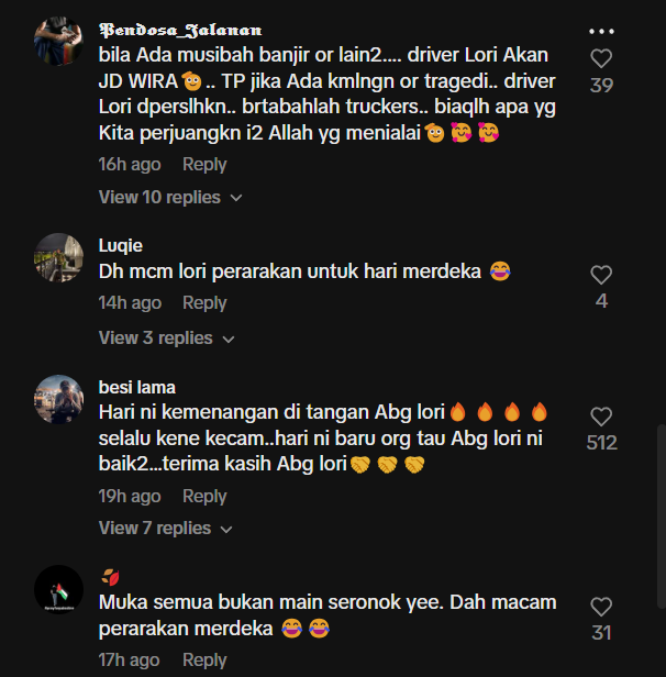 Hasil tinjauan di bahagian komen mendapati rata-rata netizen memuji tindakan pemandu lori dan mengucapkan terima kasih padanya kerana tindakannya telah membantu ramai penunggang motosikal.