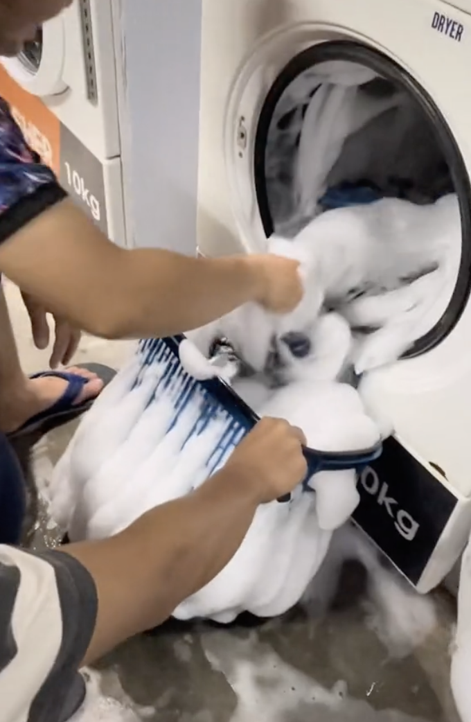 Namun, apa yang menarik perhatian ramai adalah apabila mesin basuh baju yang digunakan mereka kelihatan penuh dengan buih sehingga melimpah-limpah ke lantai.