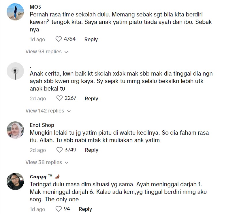 Bapa tersebut dilihat kasihan terhadap pelajar itu kerana tidak dapat merasai kasih sayang ibu bapa pada usia yang masih kecil sehingga menyebabkan dia menitiskan air mata.